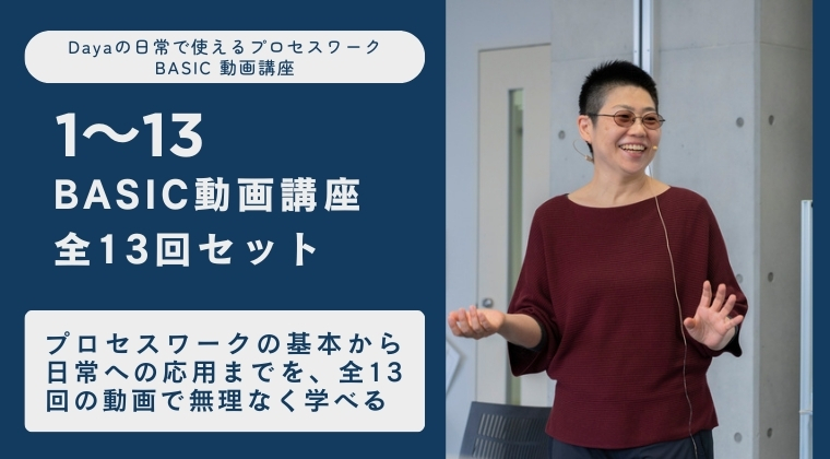 【全13回セット】Dayaの日常で使えるプロセスワークBASIC動画講座 コース ※本商品をご購入いただいた時点で、利用規約に同意したものとみなします。 【全13回セット】 対面講座「Dayaの日常で使えるプロセスワークBASIC」で扱っている内容をもとに収録しています。 プロセスワークの基本的な考え方・世界観と、日常で活かすための実践的なポイントを学ぶことができます。 「わかりやすい!」と好評なDayaの講座を、ぜひ動画でもお楽しみください! (視聴期間:購入後365日) 16,500円 購入する セルフケアセット 10点パック バンドル 【セルフケアセット】全10点 4,950円 ディープデモクラシーへの扉 Dayaのトークセッション⑦「−心の錬金術− 毒親で心を病んだ私が 毒を肥やしに変容させて 子どもと自分を育てたモノガタリ」 コース 2025年11月に開催したDayaのトークセッション「−心の錬金術− 毒親で心を病んだ私が 毒を肥やしに変容させて 子どもと自分を育てたモノガタリ」のアーカイブ動画。ご購入後14日間視聴が可能(約2時間12分) 3,300円 一日のおわりに コース 一日のおわりに、自分のことをケアするためのガイド 無料 すべてのコンテンツはこちら